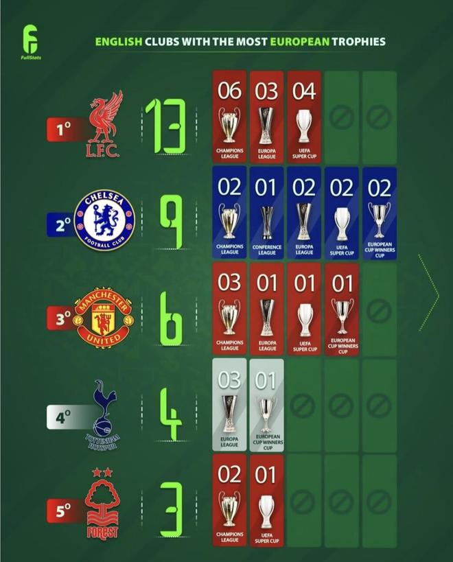 最近FullStats整理了“英格兰俱乐部欧战奖杯最多”榜单,利物浦以13座领跑,切尔西9座紧追,其后是曼联6座、热刺4座、诺丁汉森林3座等队。另一边,阿森纳只有2座、纽卡斯尔联只有1座也被放在同一张榜里对比。真正给英超争光的俱乐部一眼便能看出。