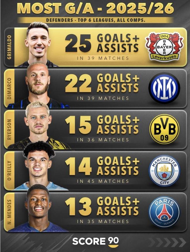 最后是迪马尔科。迪马尔科在2025/26赛季交出39场22次、场均0.56的数据,放在任何一年都是顶级边后卫的标配。但格里马尔多硬是拿出了39场25次、场均0.64的成绩压住了他。这说明不是同行衬托,而是对手本身已经很强,格里马尔多依然更胜一筹。