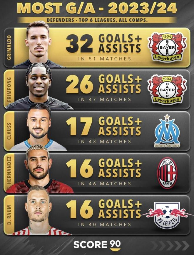 最近 Score90 连续发了三张五大联赛后卫参与进球榜,格里马尔多的名字这三年一直都在第一梯队。直接看数据:2023/24赛季51场参与32球,场均0.63;2024/25赛季48场参与17球,场均0.35;2025/26赛季39场参与25球,场均0.64。三年下来一共参与74个进球,平均每年24.7次。对于一个后卫来说,这个产出量非常夸张。更重要的是,他不是只爆了一年,而是经历了高光、回落,第三年再次杀回榜单第一。把这三张榜单连起来看,他最强的地方在于三年里两次拿第一,并且从未掉出过前排。
